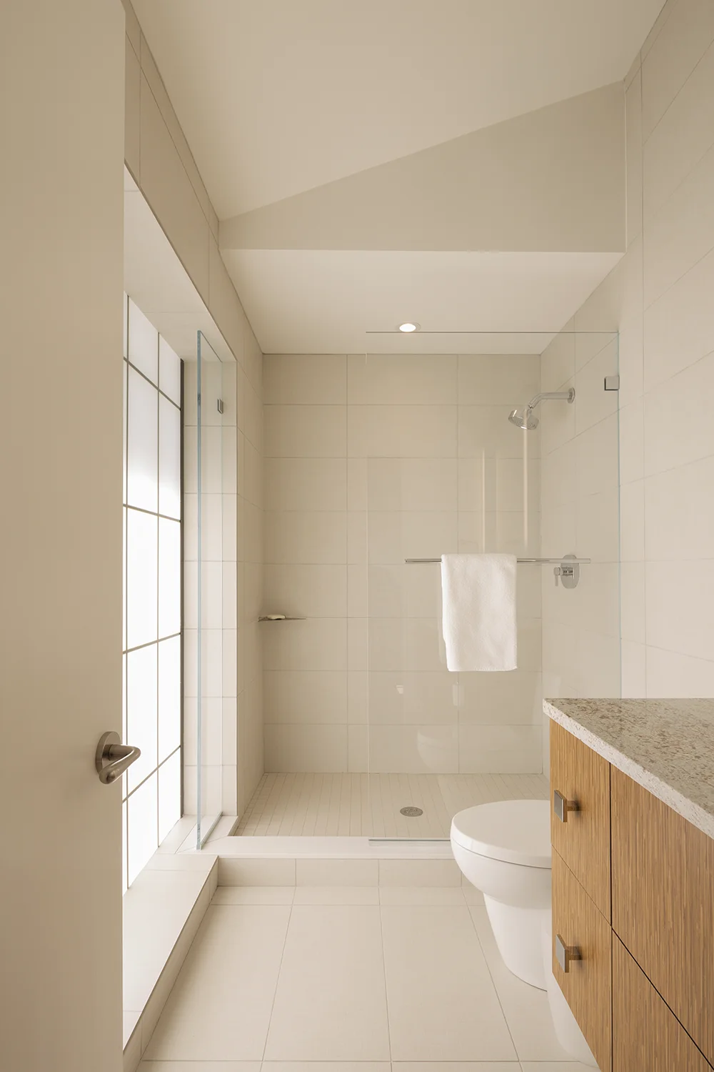 Natural ventilation plays a central role in the home’s comfort strategy. The plan captures prevailing breezes, encouraging cross-ventilation during warm months, while a ground-source radiant system provides efficient heating and cooling year-round.