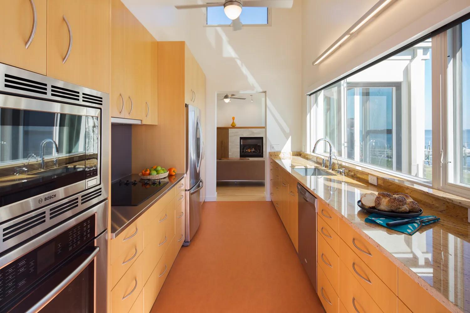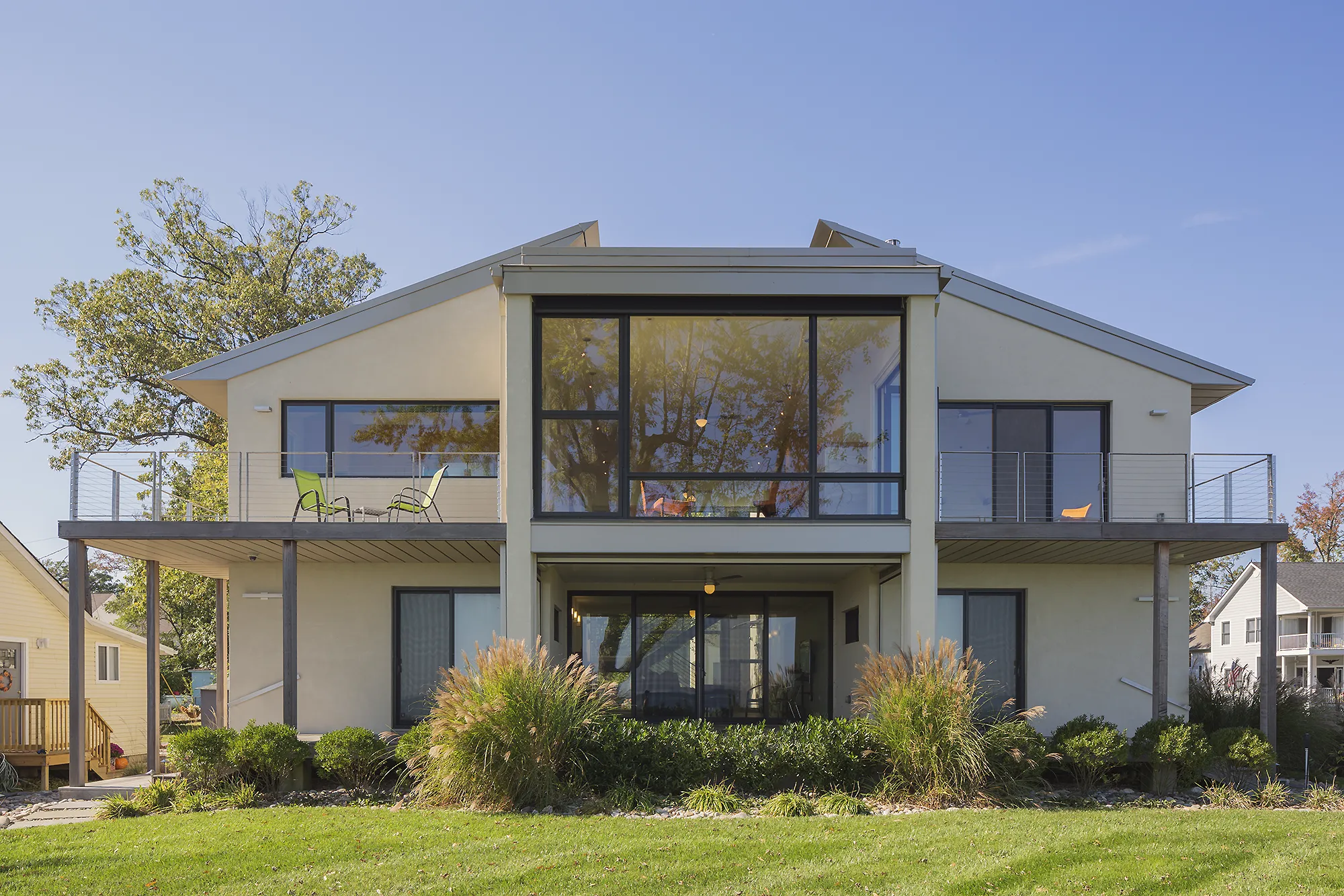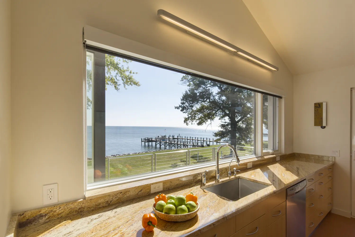 Designed for life on the water, this house balances resilience, sustainability, and a deep connection to the natural beauty of its setting. Primary living spaces are elevated to the second floor, safely above potential flooding. What began as a practical response to the site offers an unexpected advantage: from this height, sweeping views of the Bay make you feel even closer to the water. The design leans into that vantage point with expansive high-performance glass, while deep roof overhangs temper the sun, allowing natural light to fill the interiors without sacrificing comfort.