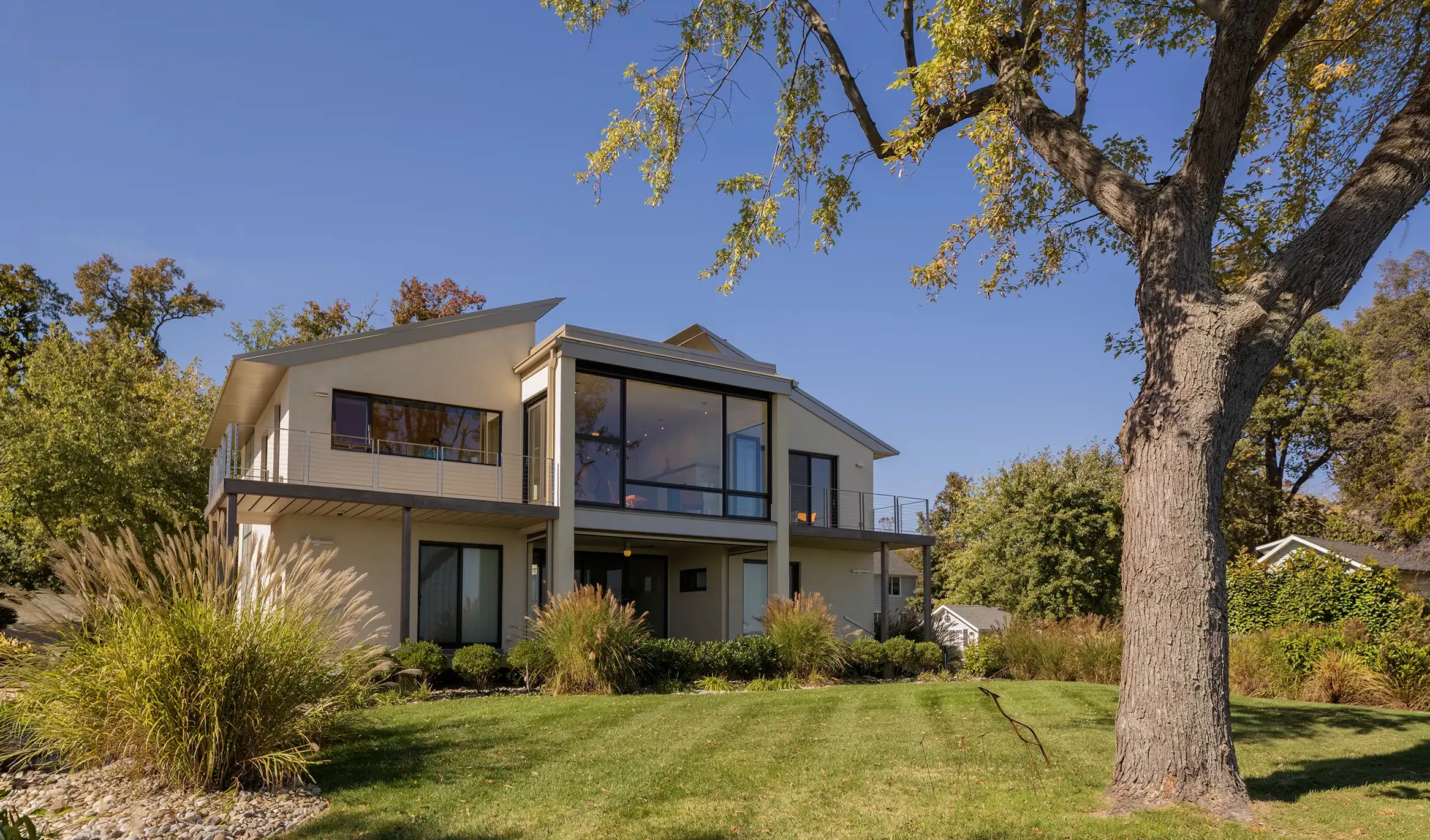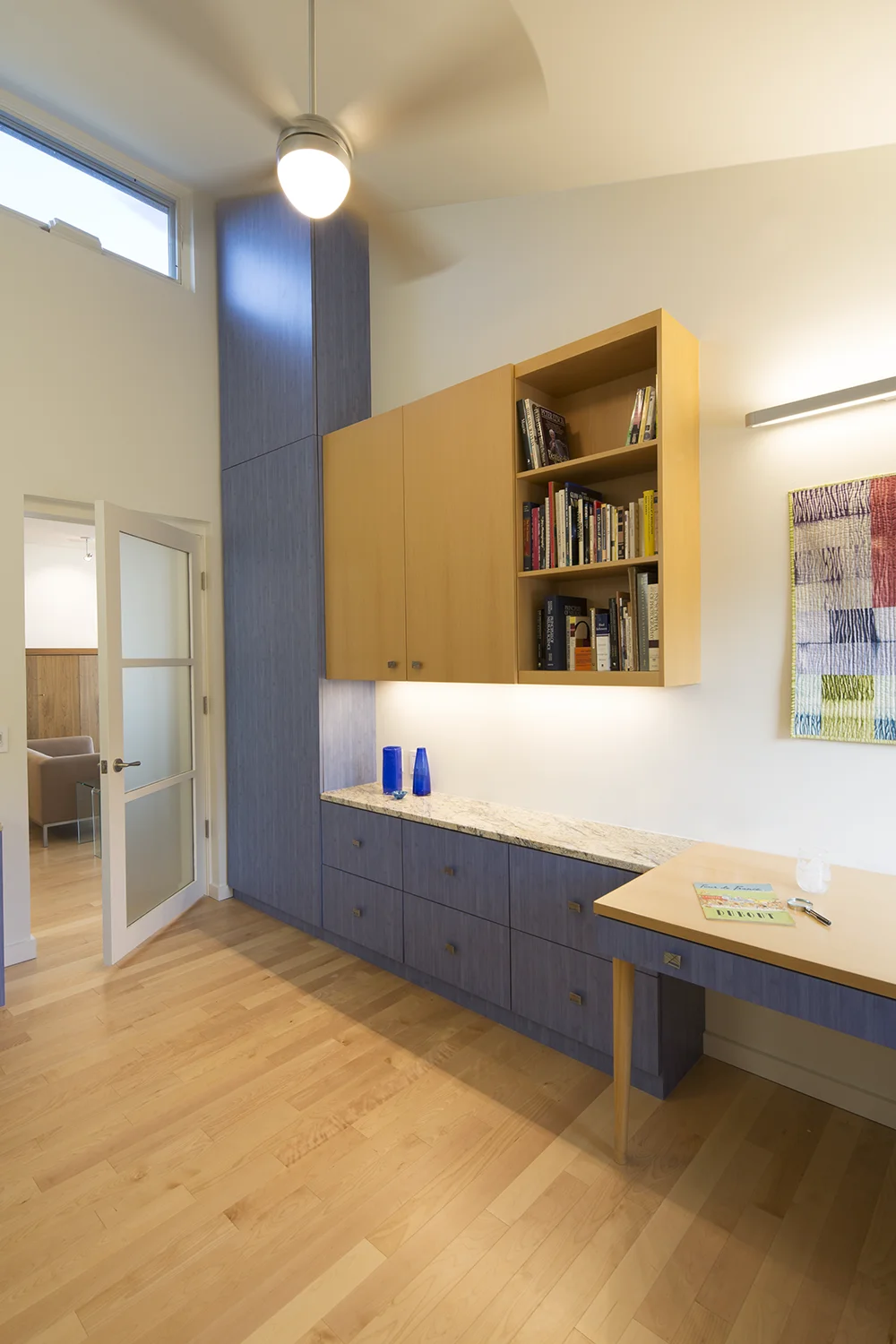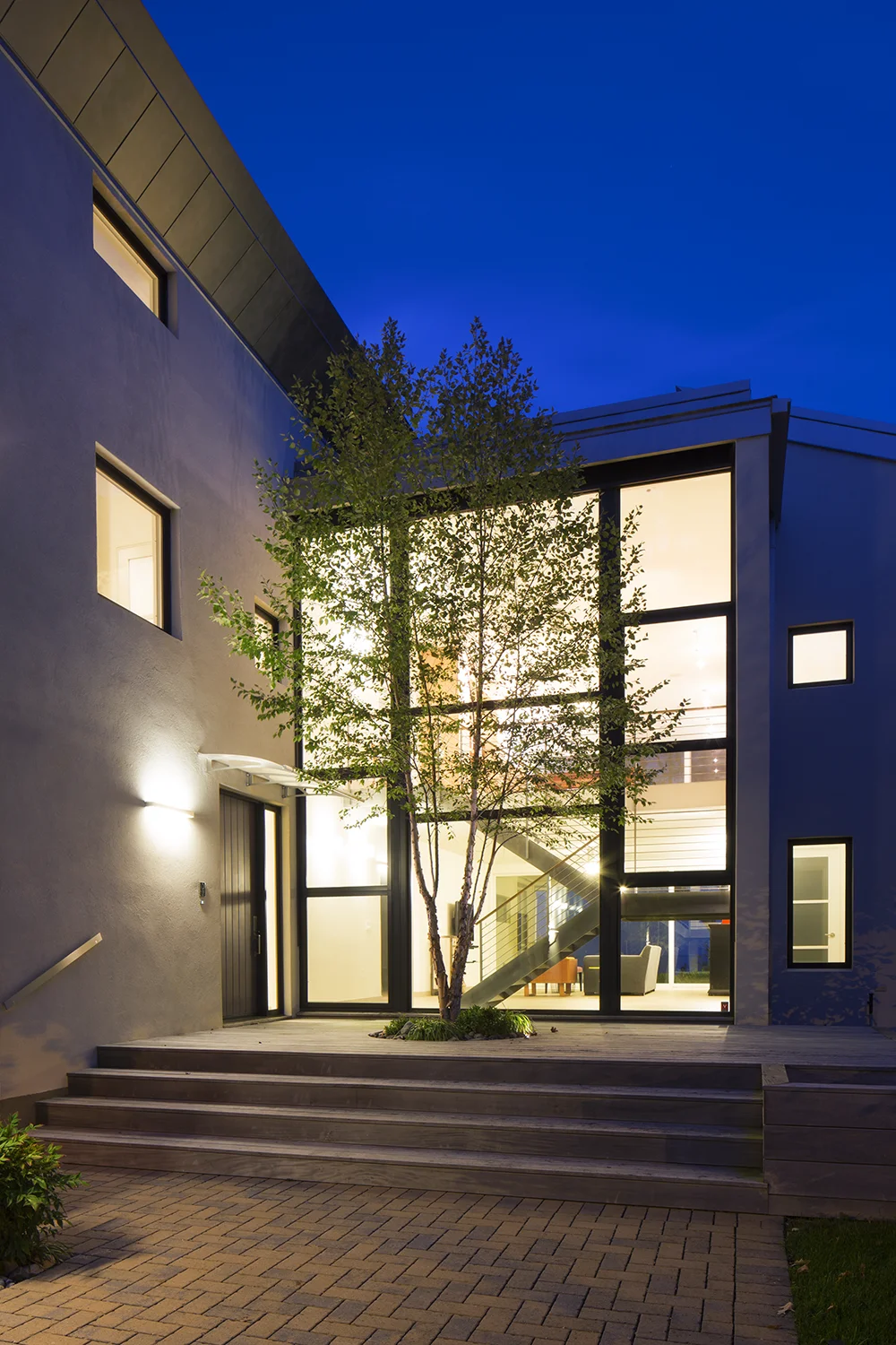Sustainability extends to the roofscape. A planted sedum roof helps manage stormwater on site, while photovoltaic panels are seamlessly integrated into the standing seam metal roof on the south-facing slope. Throughout the home, energy-efficient appliances, low-flow fixtures, and zero-VOC finishes support a goal of long-term environmental responsibility and everyday well-being.