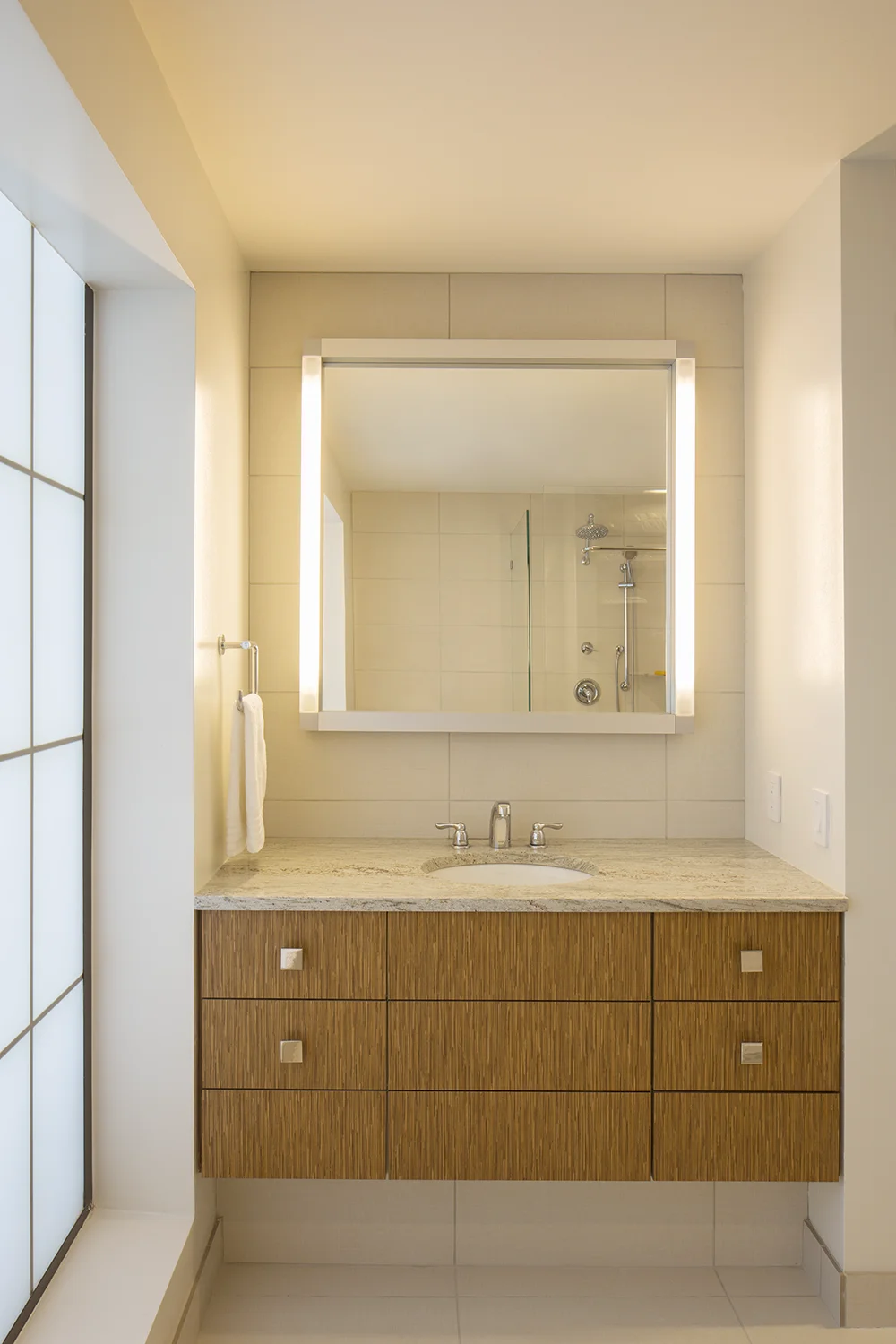 The layout is shaped by the landscape and the breeze. A central living core anchors the home, flanked by private areas and service spaces: bedrooms, offices, bathrooms, mechanical room, and an elevator. Large windows at either end of the core create a visual corridor to the water. As you approach the entry through the courtyard, you can see straight through the house to the Bay beyond — a subtle but powerful sense of arrival.
