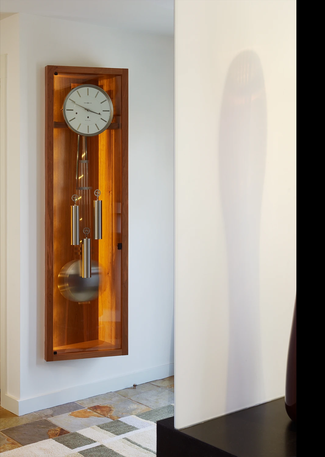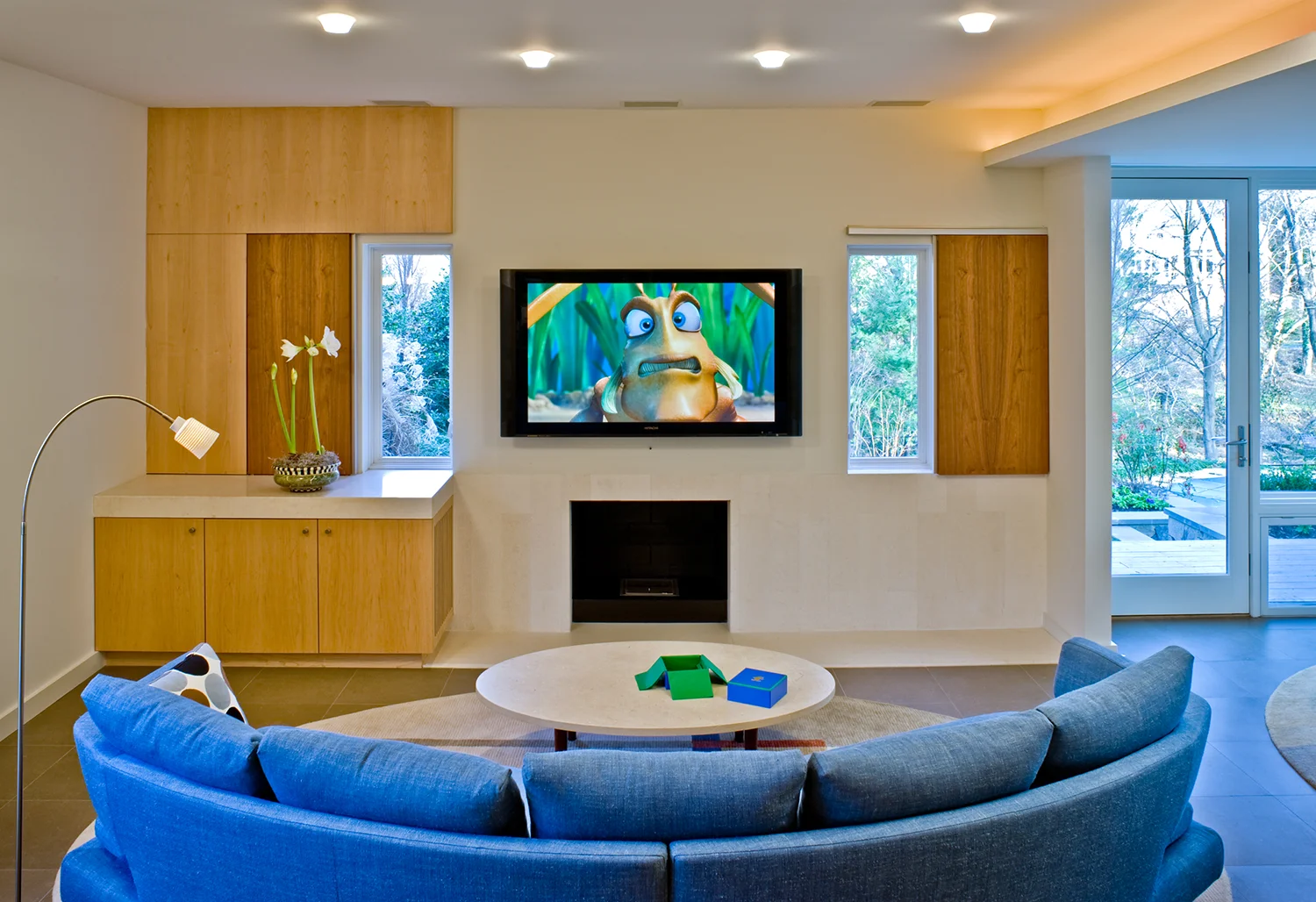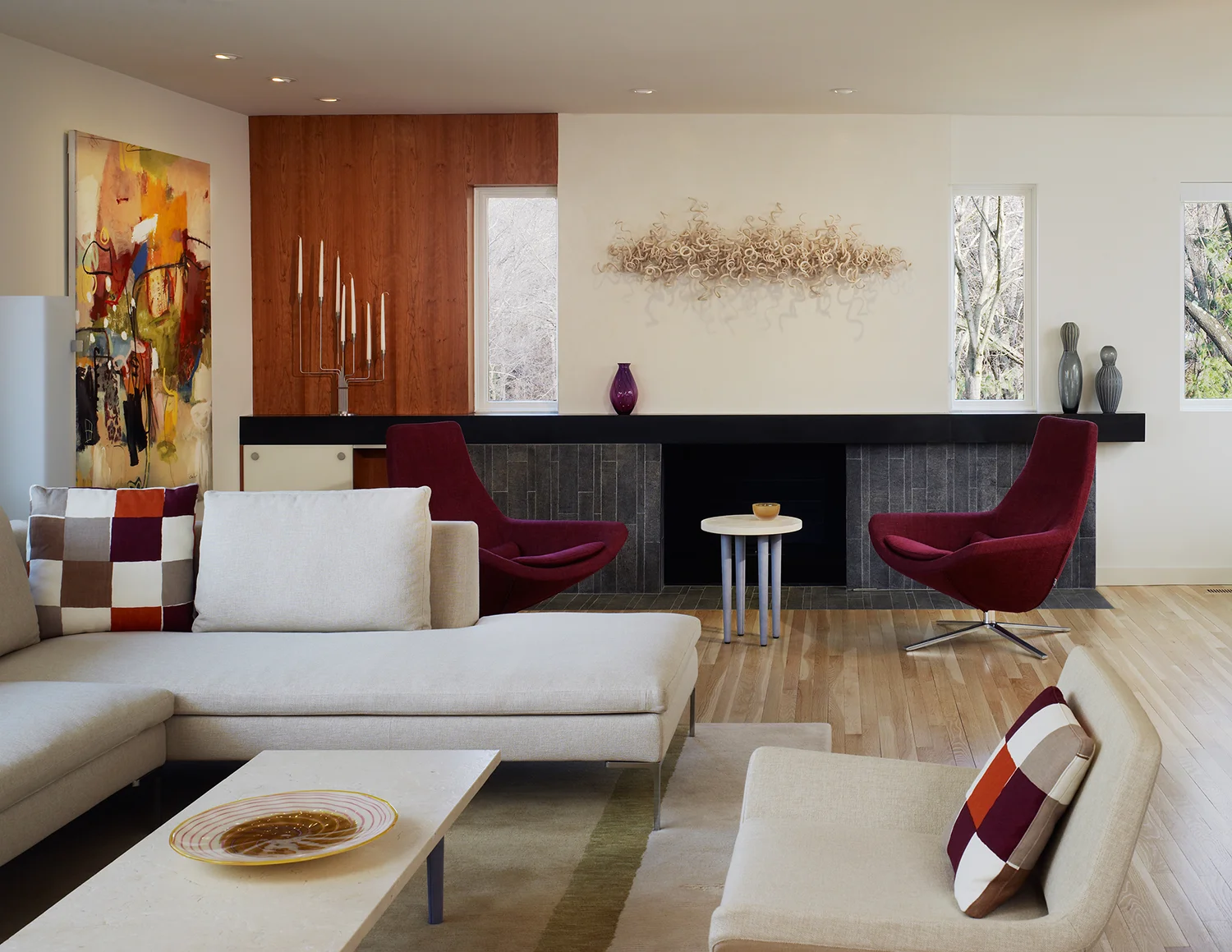In the living spaces, traditional elements were recalibrated. A tall, oversized fireplace surround was replaced with a low horizontal composition that visually expands the room. Custom built-ins provide storage and display for the owners’ growing glass collection without crowding the space. Indirect lighting subtly animates walls and ceilings, creating warmth without visual clutter. A new bar, wine cellar, and renovated bath extend the lower level into a cohesive gathering space.