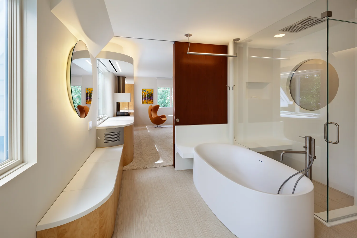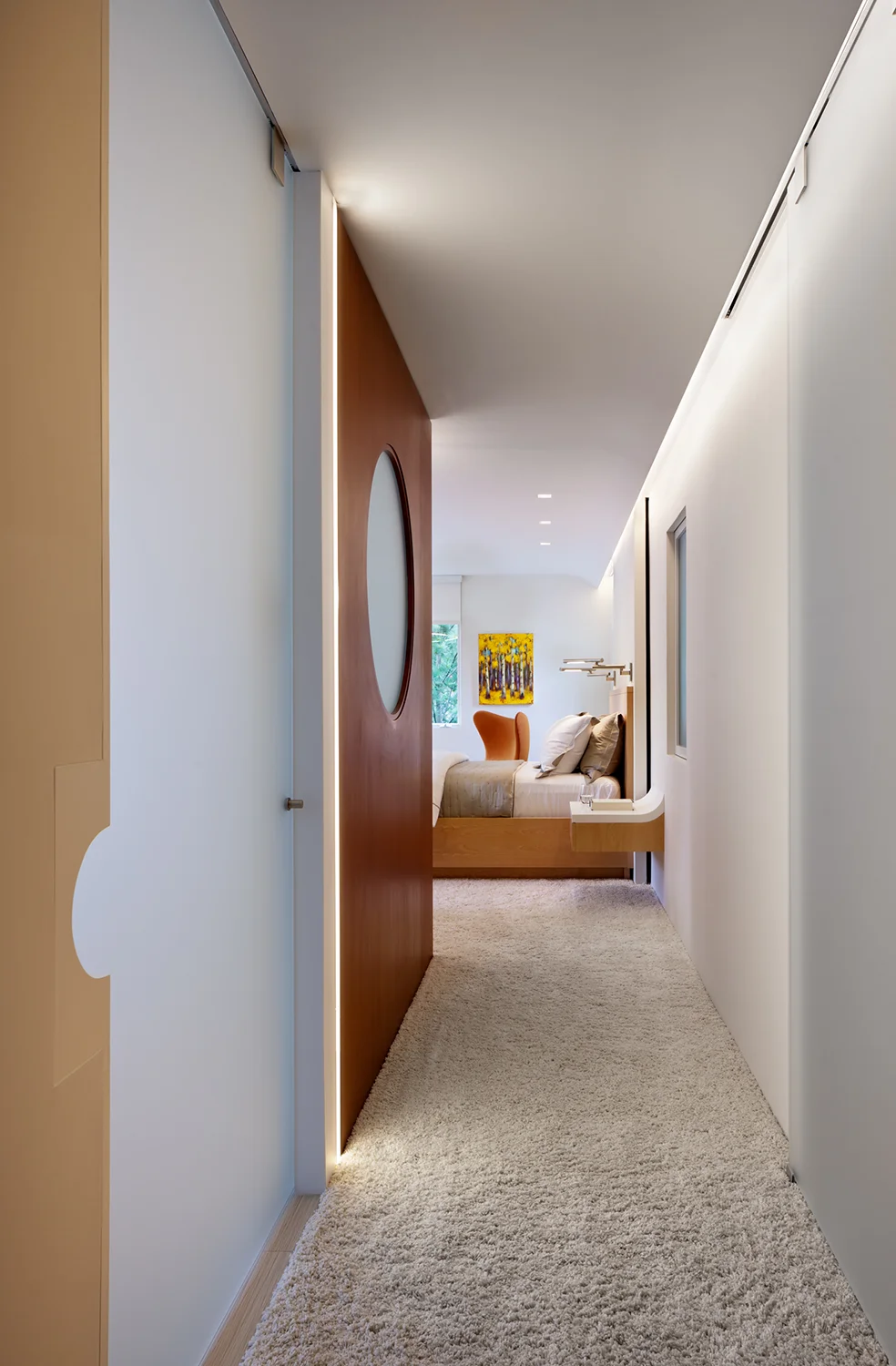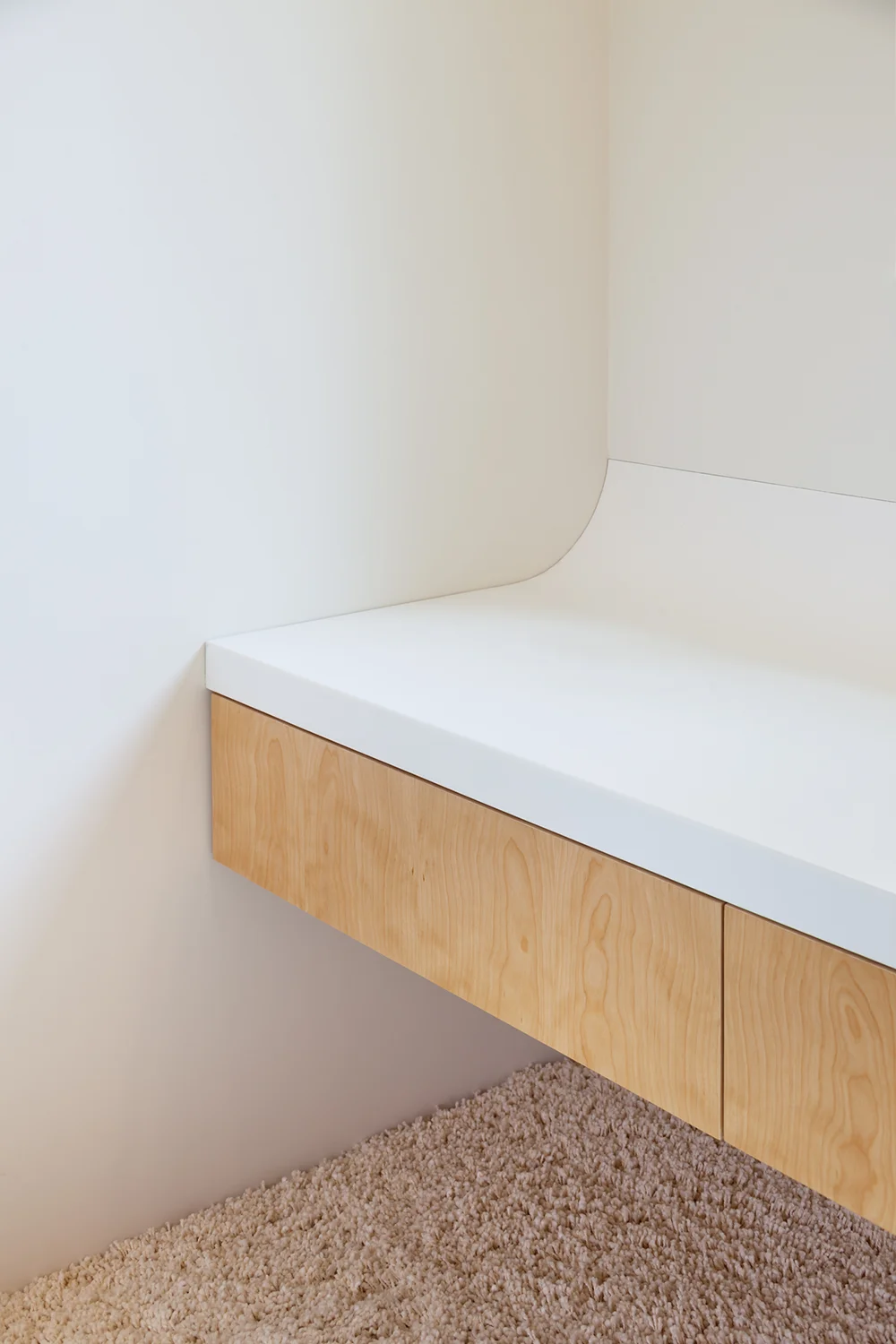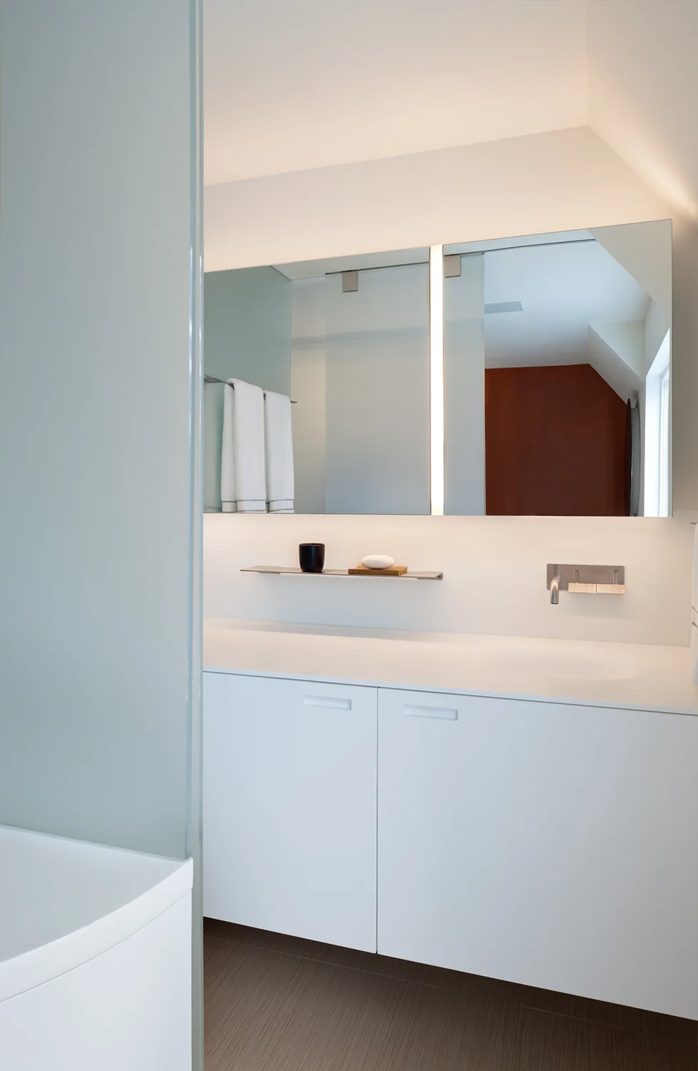 Years later, the clients returned to us to renovate the primary suite. The existing bath was crowded and dark, dominated by an oversized tub and a steam shower that had deteriorated over time. We reorganized the circulation, grouped plumbing efficiently, and freed open space near the window. A restrained material palette and layered lighting create calm brightness. Low storage with an integrated firebox creates a cozy atmosphere with ample storage to keep the room tidy. A porthole window in the shower — echoing one used in the children’s bathroom — brings borrowed light into the hallway. Built-in bedside tables peel seamlessly from the wall, floating above the floor.