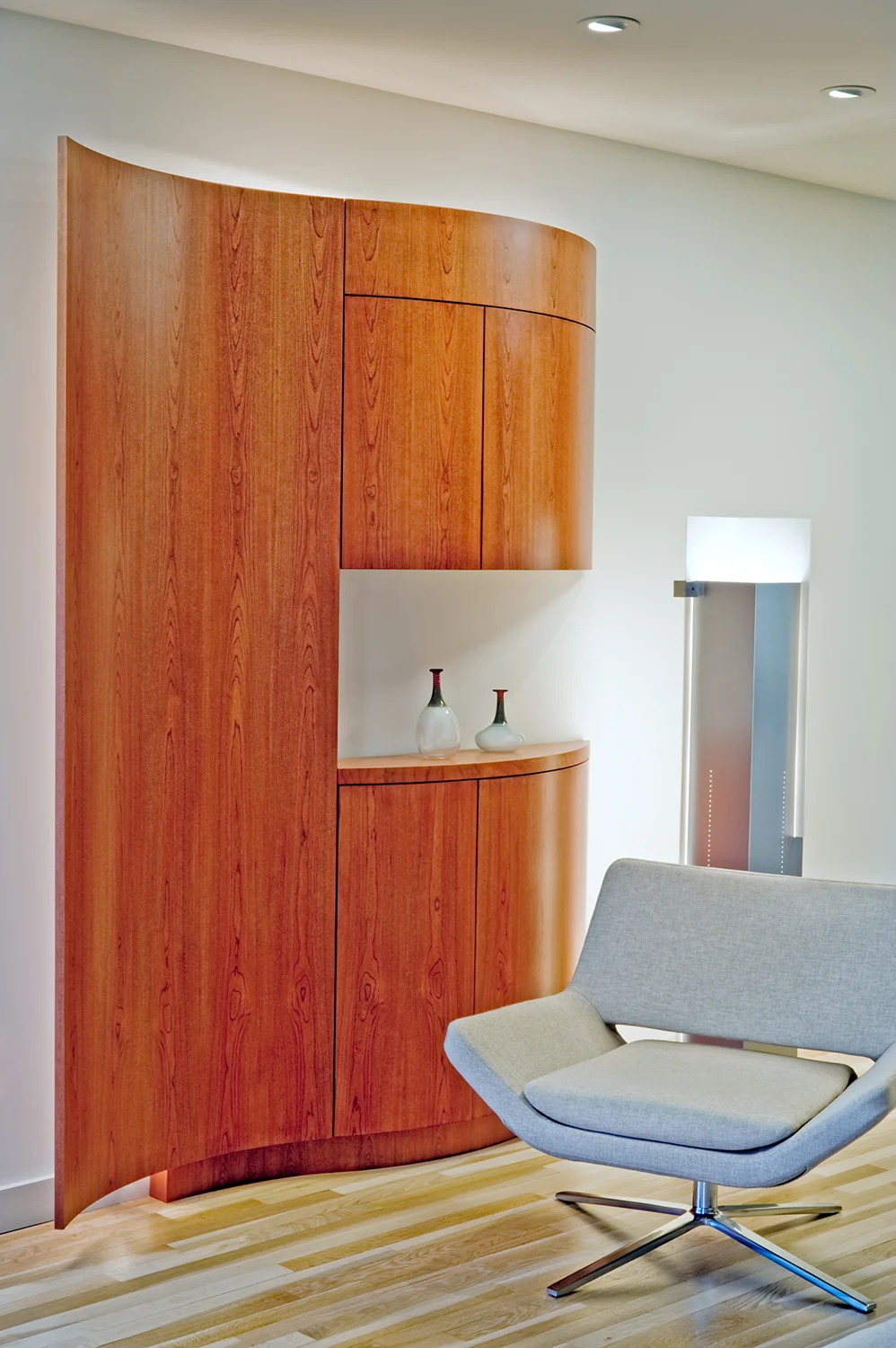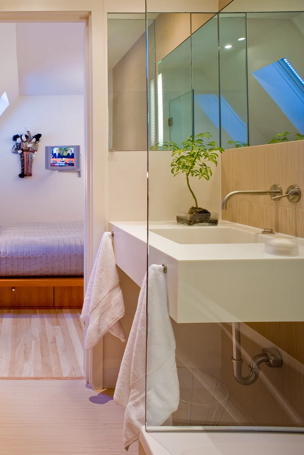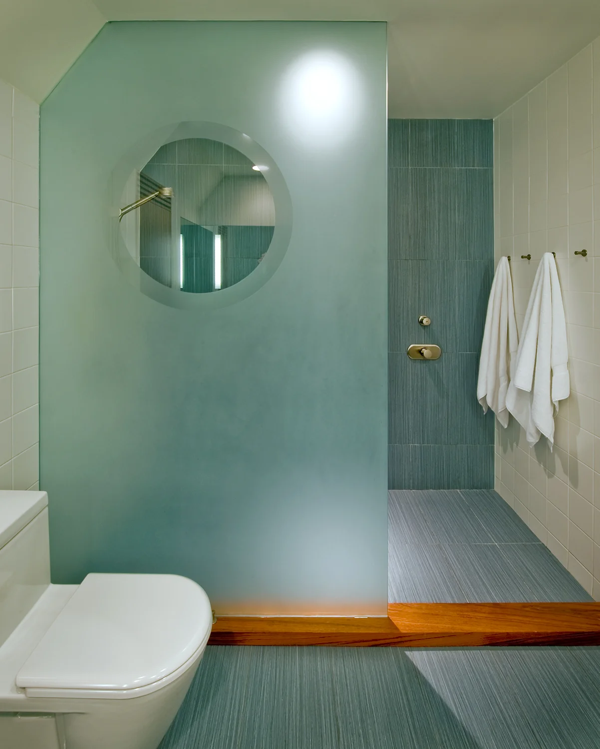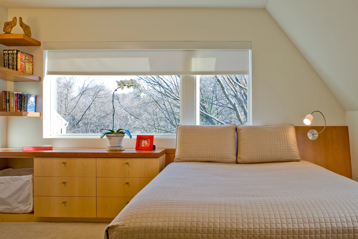 Years later, the clients returned to us to renovate the primary suite. The existing bath was crowded and dark, dominated by an oversized tub and a steam shower that had deteriorated over time. We reorganized the circulation, grouped plumbing efficiently, and freed open space near the window. A restrained material palette and layered lighting create calm brightness. Low storage with an integrated firebox creates a cozy atmosphere with ample storage to keep the room tidy. A porthole window in the shower — echoing one used in the children’s bathroom — brings borrowed light into the hallway. Built-in bedside tables peel seamlessly from the wall, floating above the floor.