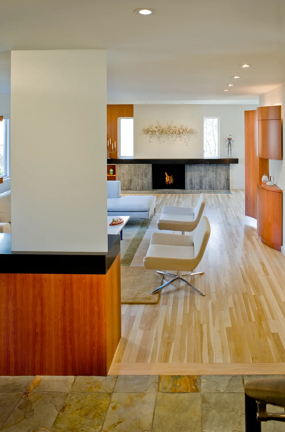 The project began modestly: a renovation of the walkout basement, the main-floor living and dining rooms, and the upstairs bedrooms and baths. As the design developed, the scope expanded into a comprehensive reworking of the house, including the entry sequence, a new stair, custom furniture, and millwork throughout.