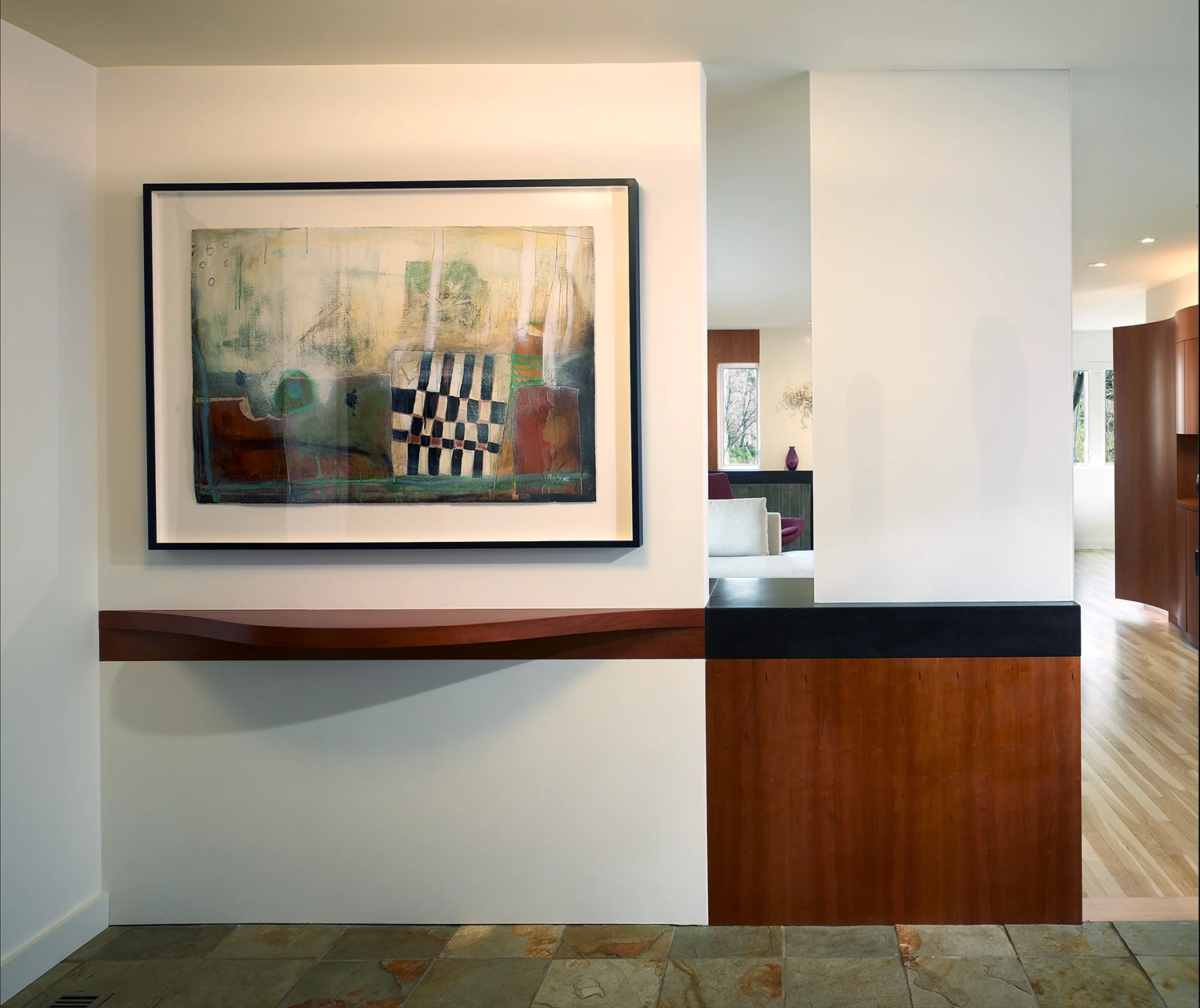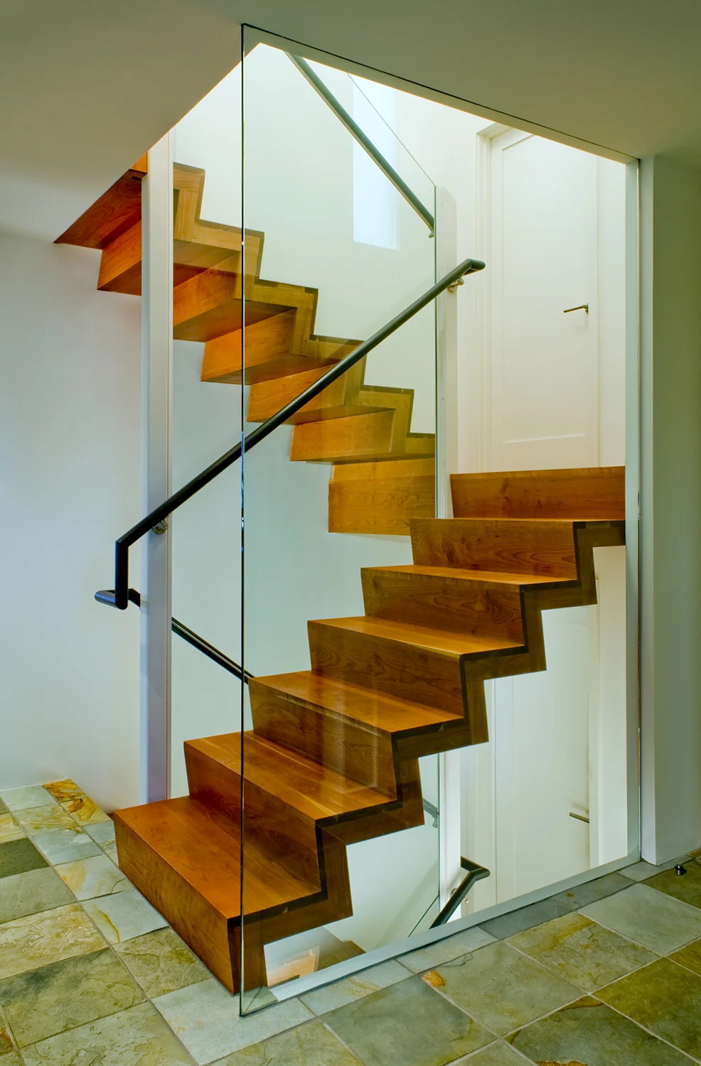 The first move was to clarify circulation. Walls were selectively removed to open the entry while maintaining moments of compression and release. The living room was partially screened, revealing itself gradually as one passes by. Its entrance was realigned with a new stair — a sculptural, free-floating zig-zag form exposed deliberately to celebrate the form while allowing light into the once-dark stairwell. To further that endeavor, a frosted glass sidelight at the office door borrows abundant southern light from above.