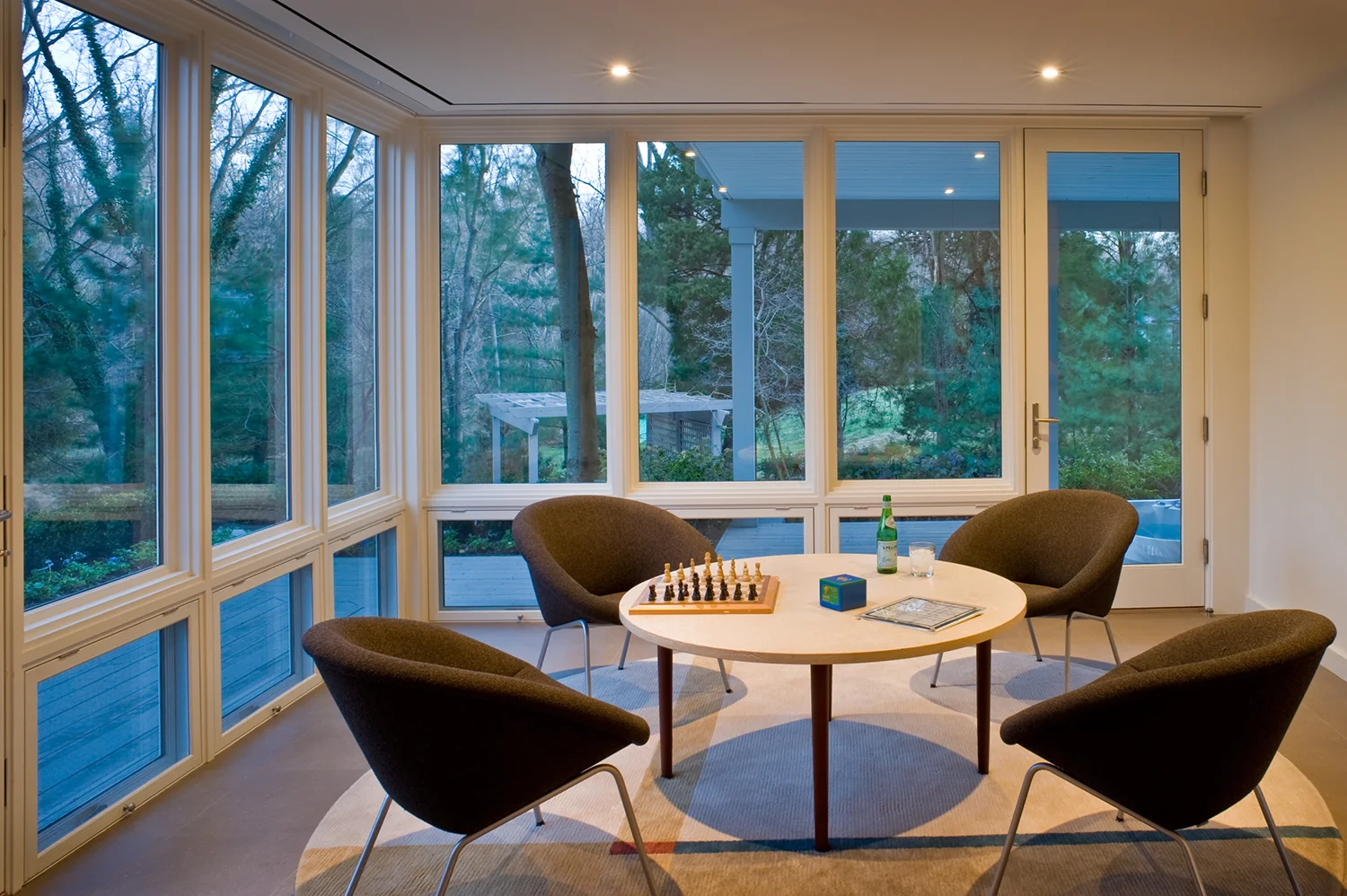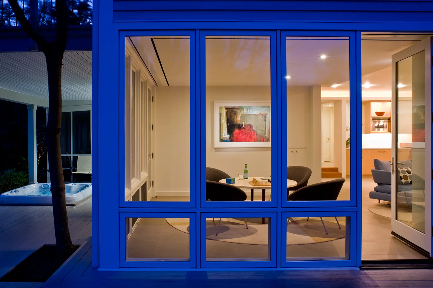 In the basement, a favorite corner used for games and puzzles felt dark despite its connection to the backyard and pool. We opened the walls with glass and added a second door for both visual and physical access, transforming the once-dark corner into a place closely connected to the landscape and nearby hot tub.