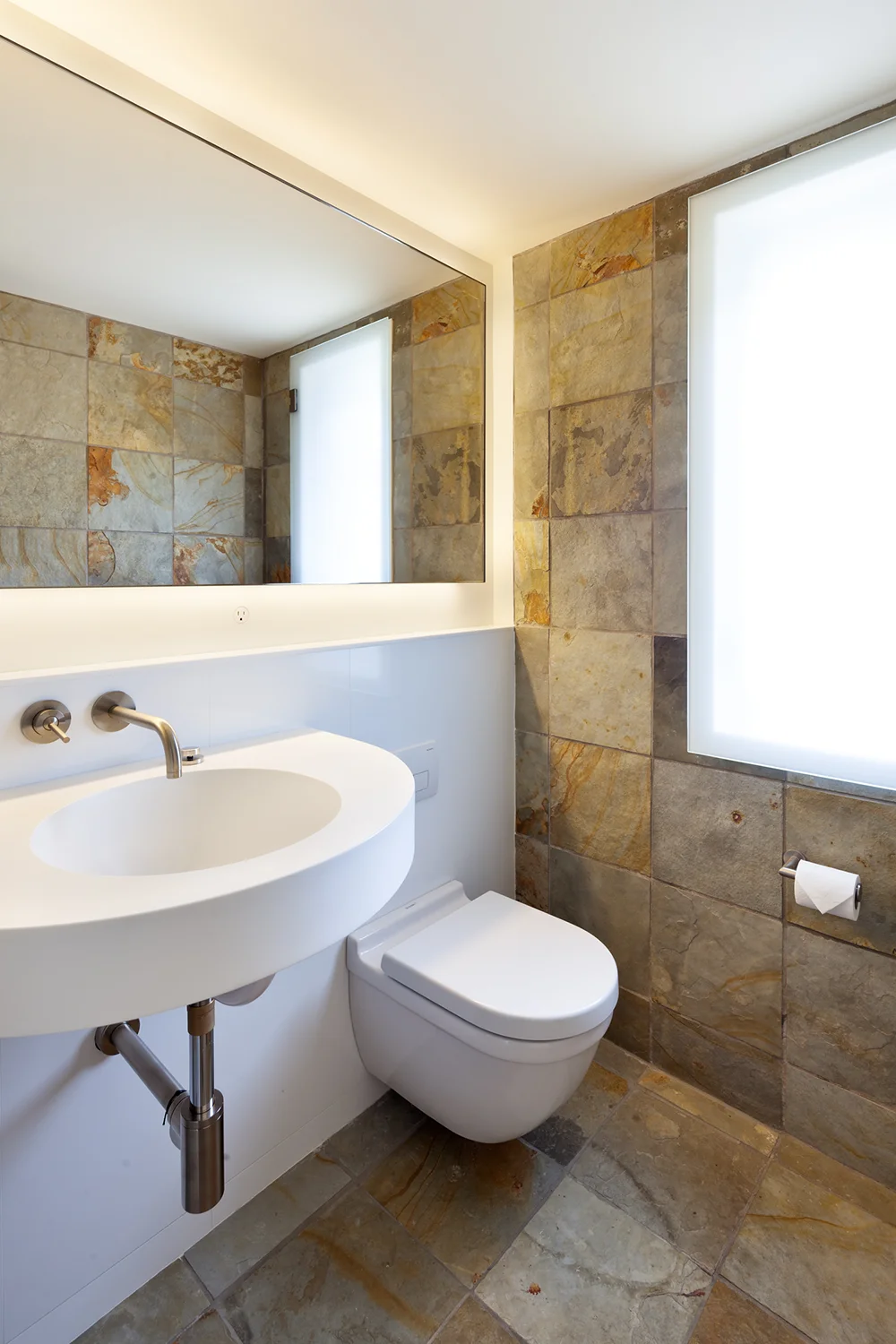 Upstairs, efficiency was essential. The children’s bedrooms were modest in size; integrated beds, desks, shelving, and concealed shoe storage maximize function without excess. In the bathrooms, awkward layouts were reorganized and the space below sloping ceilings used for recessed storage.